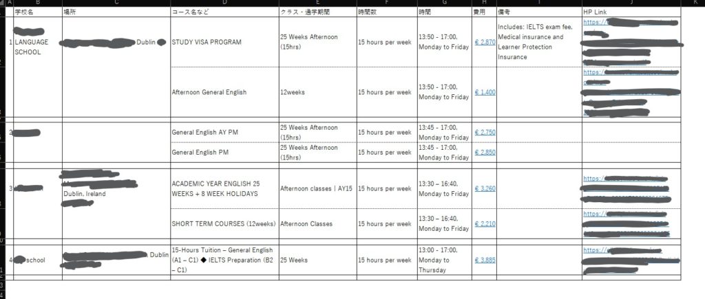 費用と内容のバランスを見ながら、いくつかの学校を並べて比較してみました。